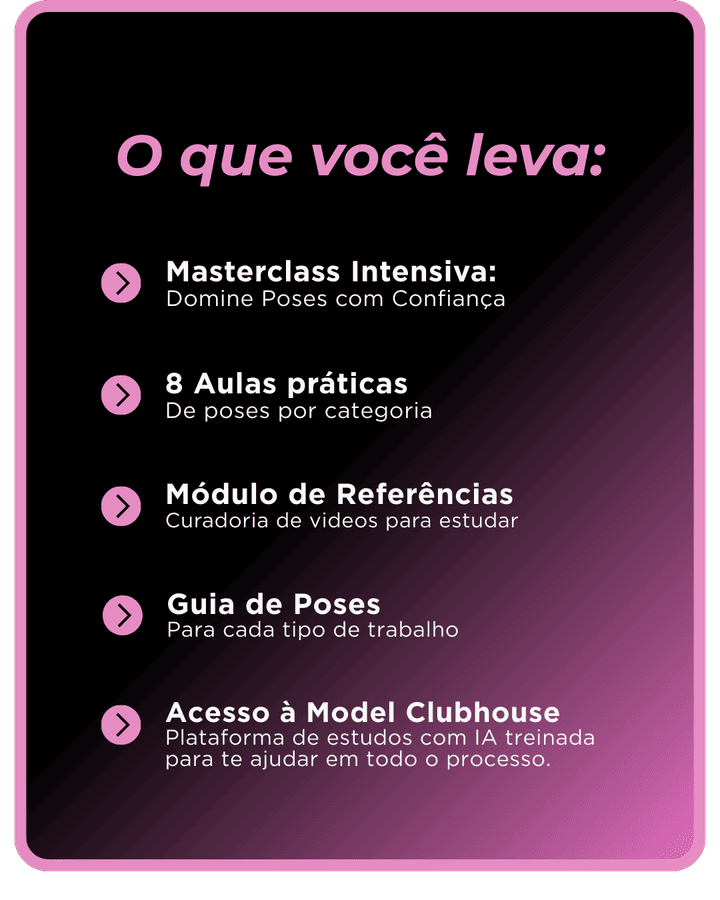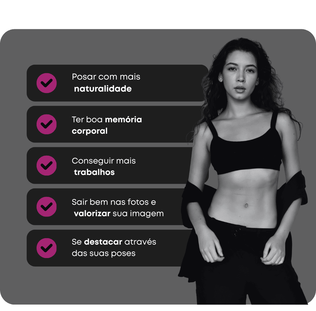 Vou te ajudar a criar sua base de poses, treinar com intenção e dominar a expressão certa pra cada tipo de trabalho — mesmo que você ainda esteja começando ou se sinta travada hoje.